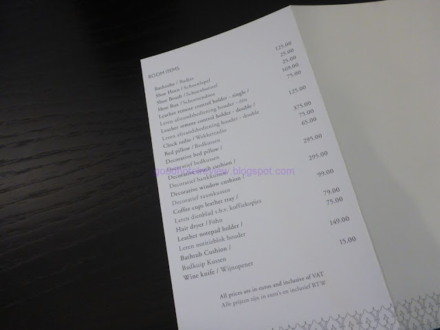 A card in the room shows the prices of the items in the minibar, as well as other items in the room.