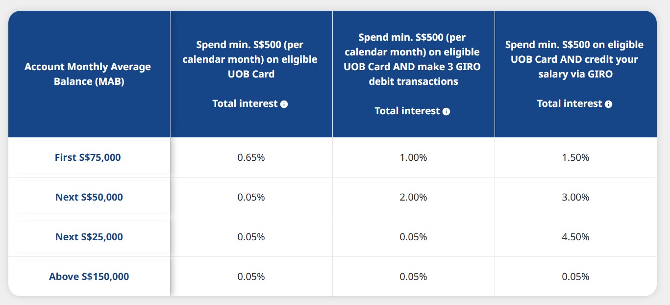 By crediting your monthly salary of at least S$1,600 via GIRO or PayNow (with the code SALA/PAYNOW SALA) and spending at least S$500 per month on the UOB Lady’s Cards, you could earn up to 2.5% p.a. on the first S$150,000 in your UOB One Account.