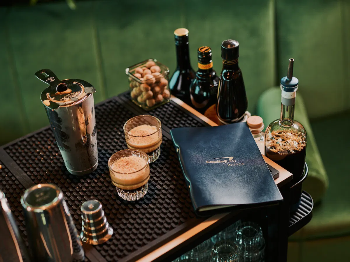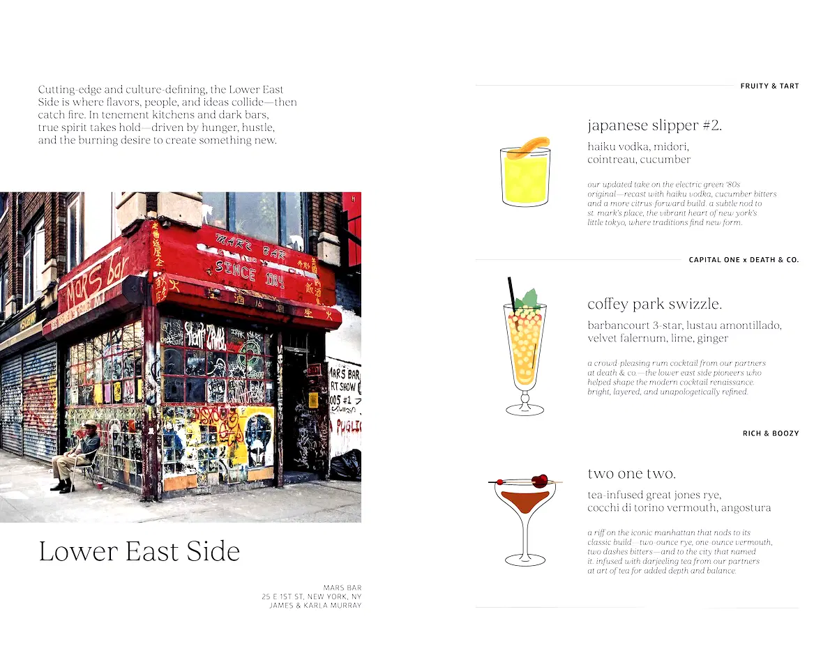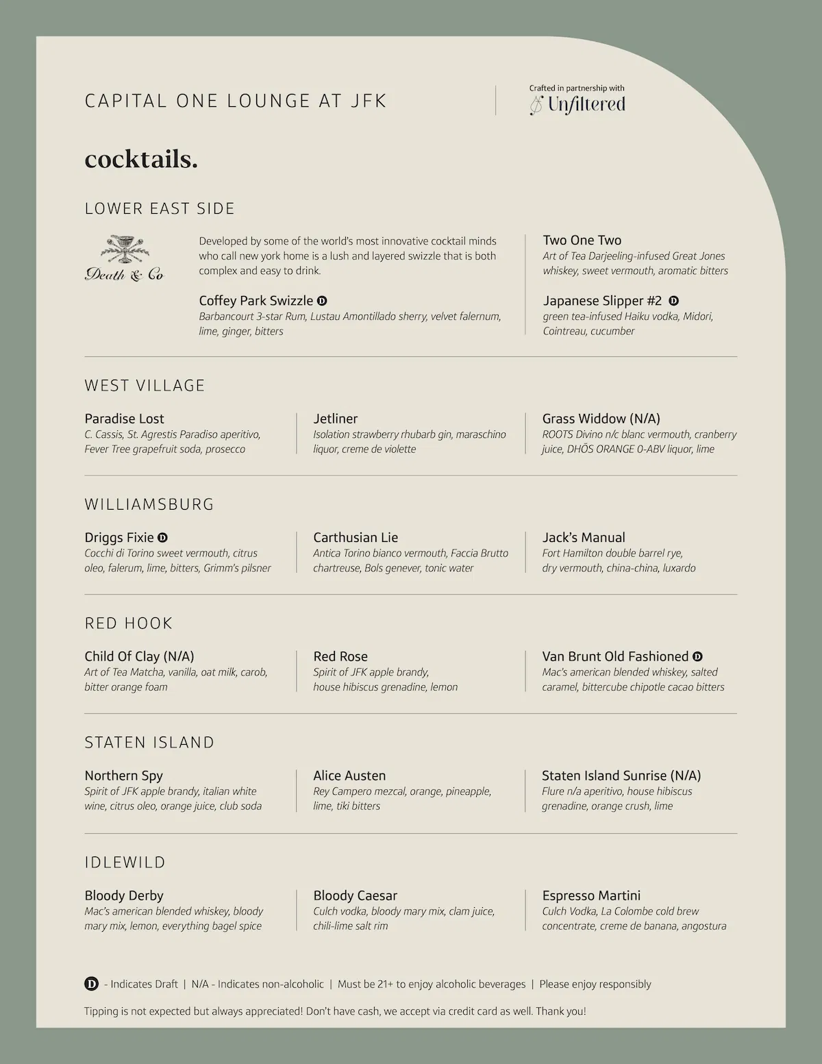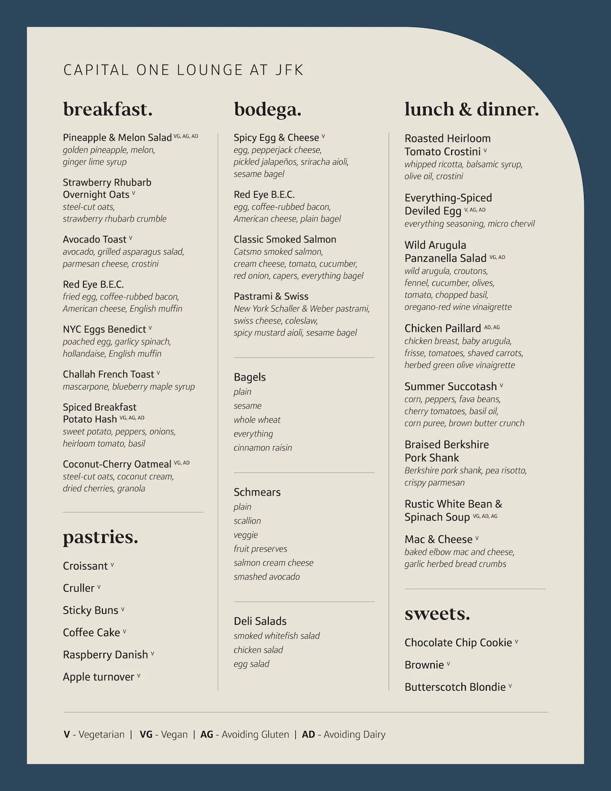 Capital One describes this lounge as “a bold tribute to NYC, leveraging design, destination-inspired food and beverage offerings, and immersive local partnerships to bring the spirit and sophistication of the city to life.” Inside, you’ll find a Central Park-inspired dining area, a Manhattan-style bar, and various artworks by New York-based artists.
