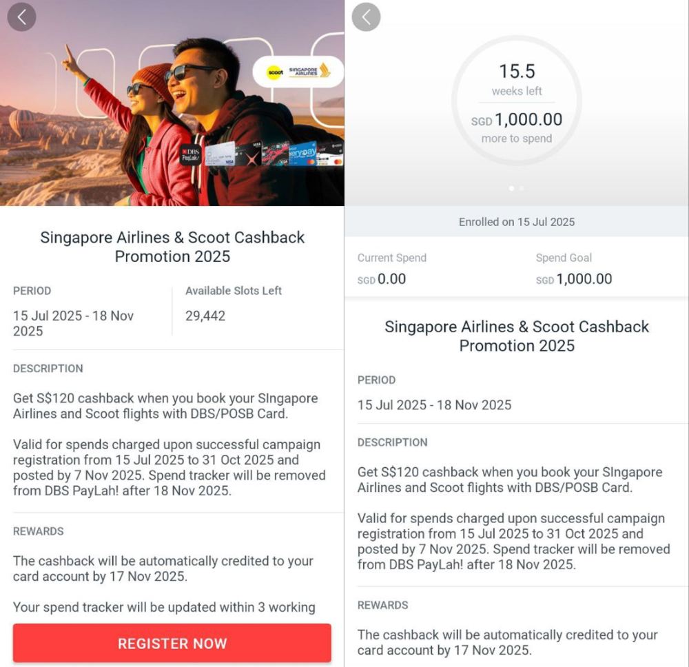 From 15 July to 31 October 2025, DBS cardholders can register to earn S$120 cashback on Singapore Airlines and Scoot tickets.