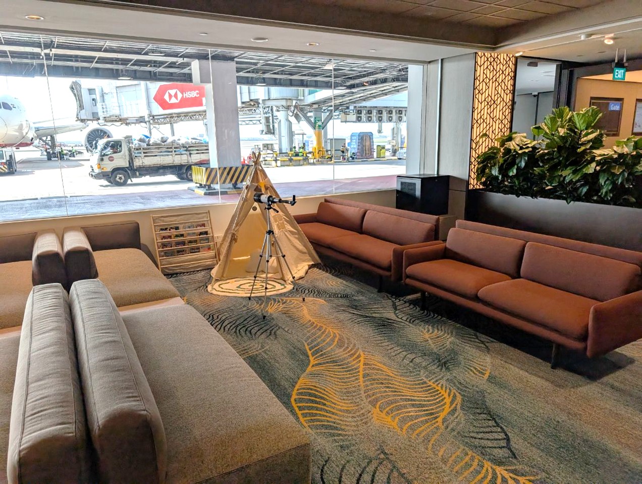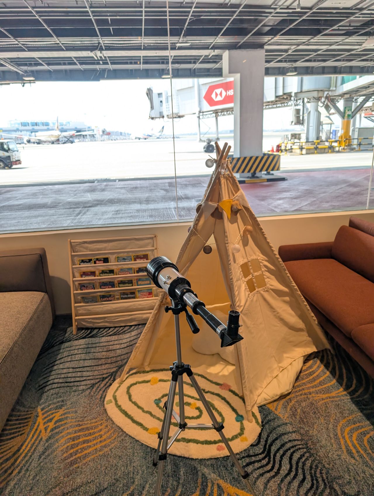 That said, there is a small kids’ corner with a small bookshelf, teepee, and a telescope for airplane spotting.