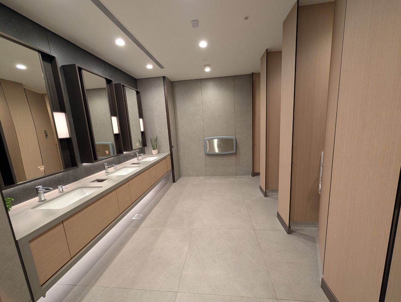 The ladies room is the smaller of the two, somewhat surprisingly, and has four stalls equipped with manual bidet seats.