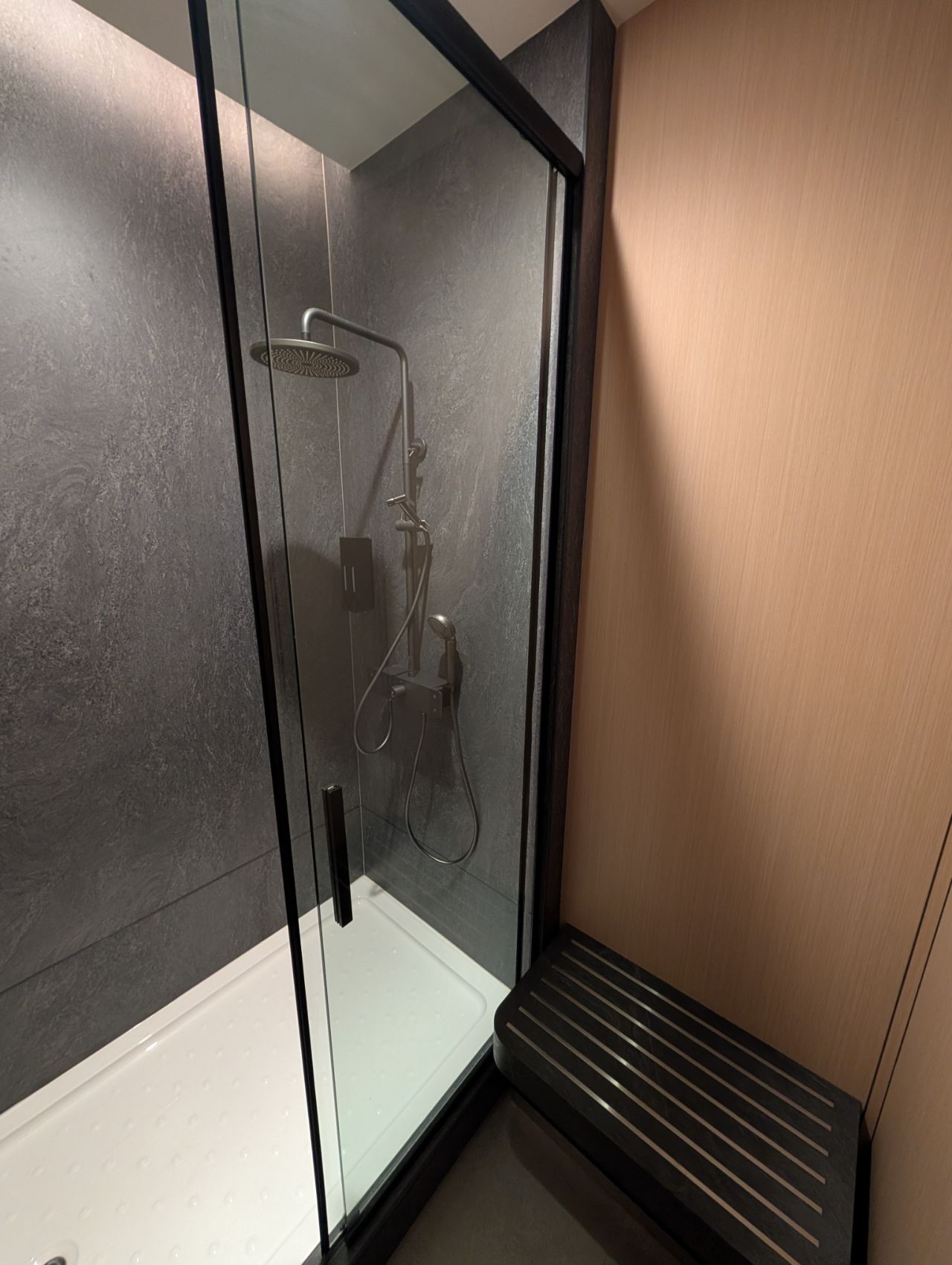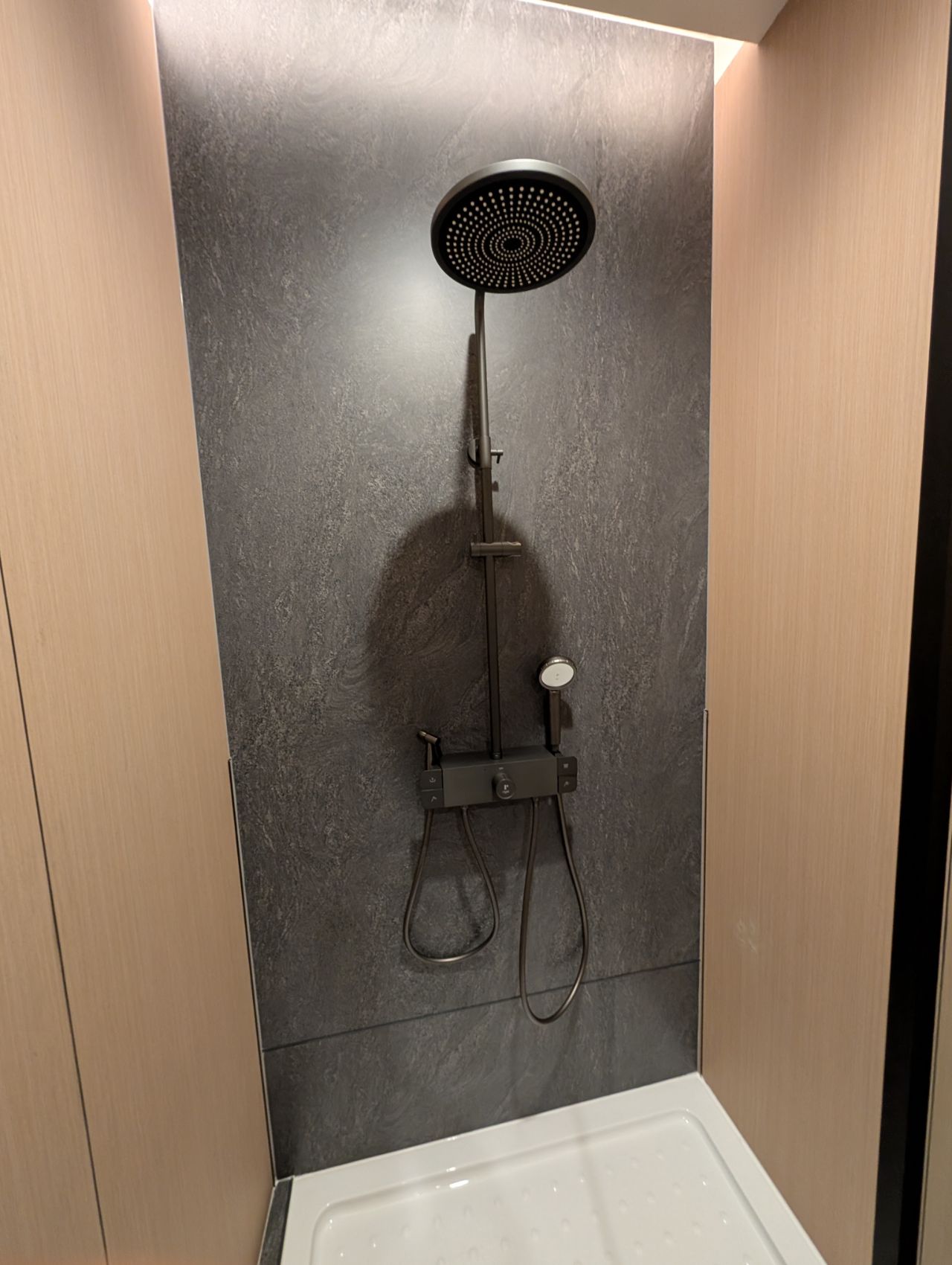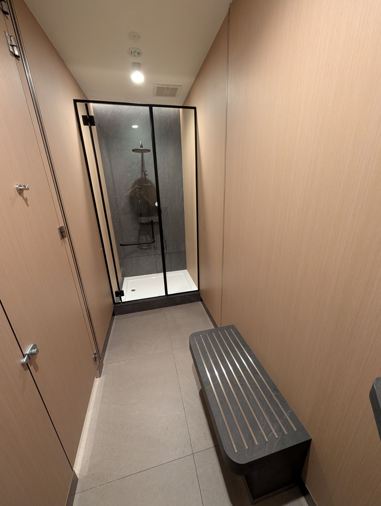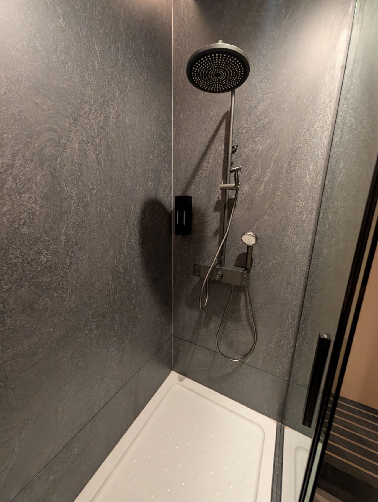 There is a single, rather cramped shower cubicle equipped with a piano-key mixer with rain shower, hand shower, and rather perplexingly, bidet spray (I think someone mixed up the positioning of the bidet spray and hand shower!). The generic wall-mounted soap dispensers give a rather YMCA feel, but again, it’s something I’ll give them a pass on because of the temporary nature of this facility.