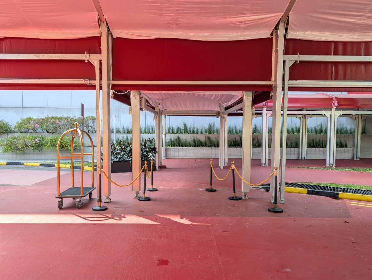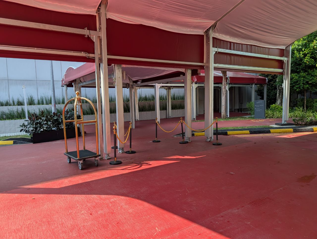 Unlike the current CIP Terminal, with its high walls and security post, the only hint that something exclusive resides here is the presence of a gold-tinted bellhop cart and stanchions, beneath an all-weather awning. It has a rather makeshift feel, but then again, it is.