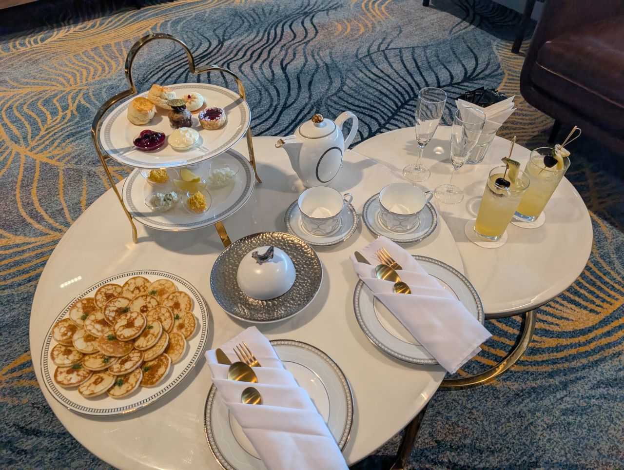 Each of the Jet Suites had a bottle of Ruinart Blanc de Blancs on display (which JetQuay tells me will be available to Quayside guests too). There was also a high tea setup on display, together with blinis which suggest caviar will be on the menu.
