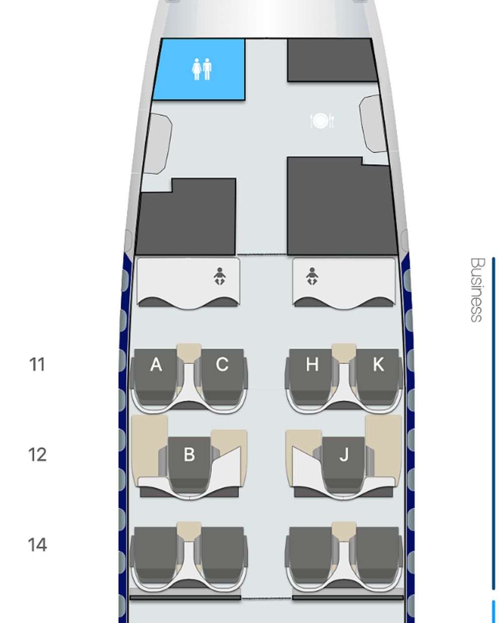 On the one hand, this means that only 60% of passengers have direct aisle access. On the other, it means that two lucky passengers — in 12B/J — get throne seats with extra privacy.