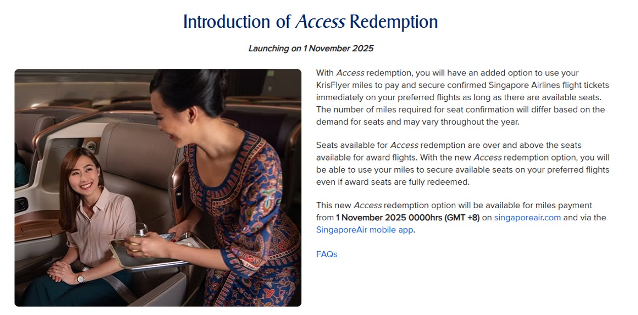 On 1 November 2025, the same day the new redemption charts come into effect, Singapore Airlines will add “Access” awards, a new category of award where mileage requirements depend on dynamic factors like seat demand and seasonality.