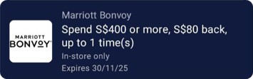 American Express has launched a new AMEX Offer for Marriott Bonvoy, which gives registered cardholders an S$80 statement credit with a minimum spend of S$400 at participating hotels, bars, restaurants and spas by 30 November 2025.