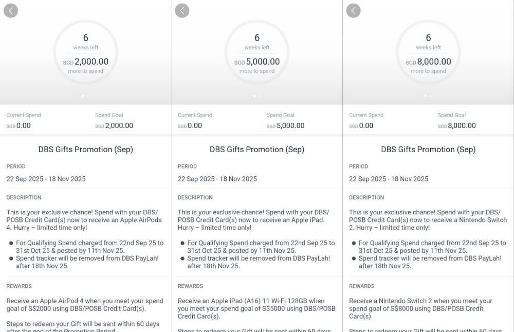 DBS has rolled out a new targeted spending promotion for selected credit cards, which offers cardholders gifts including Apple AirPods, an iPad, or a Nintendo Switch 2 upon meeting a certain minimum spend.
