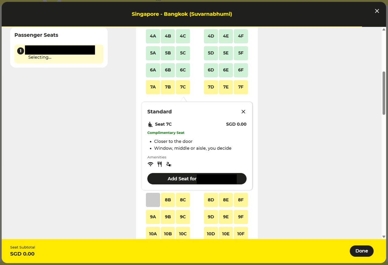 However, when you click the button to add a seat, you’ll be brought to the seat selection screen where you can select Standard Seats (coloured in yellow) at no cost.