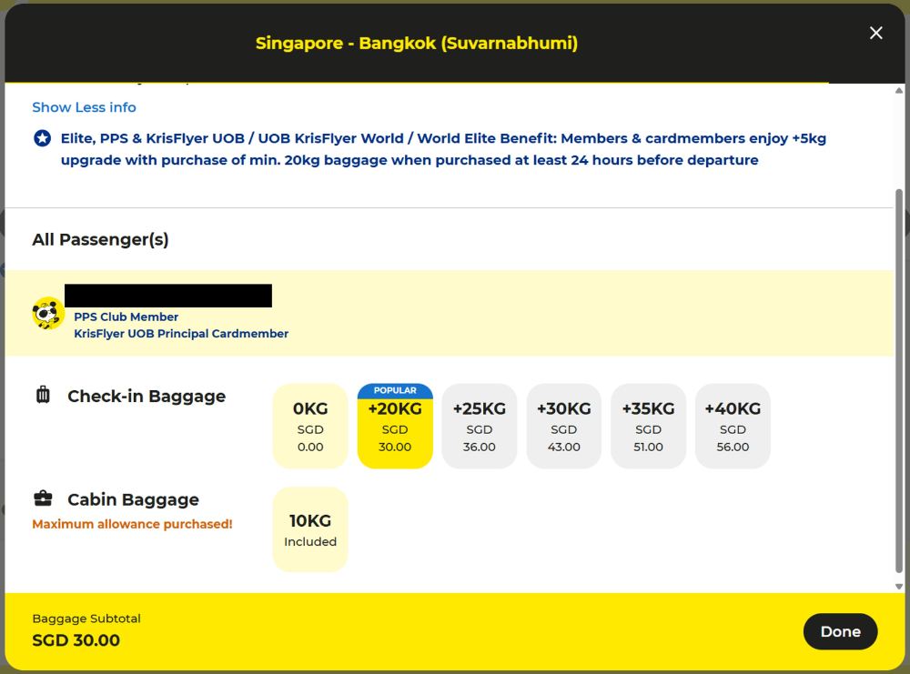 KrisFlyer UOB Cardholders who purchase at least 20kg of checked baggage will receive an extra 5kg allowance. This only applies to the principal cardholder.