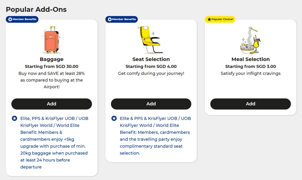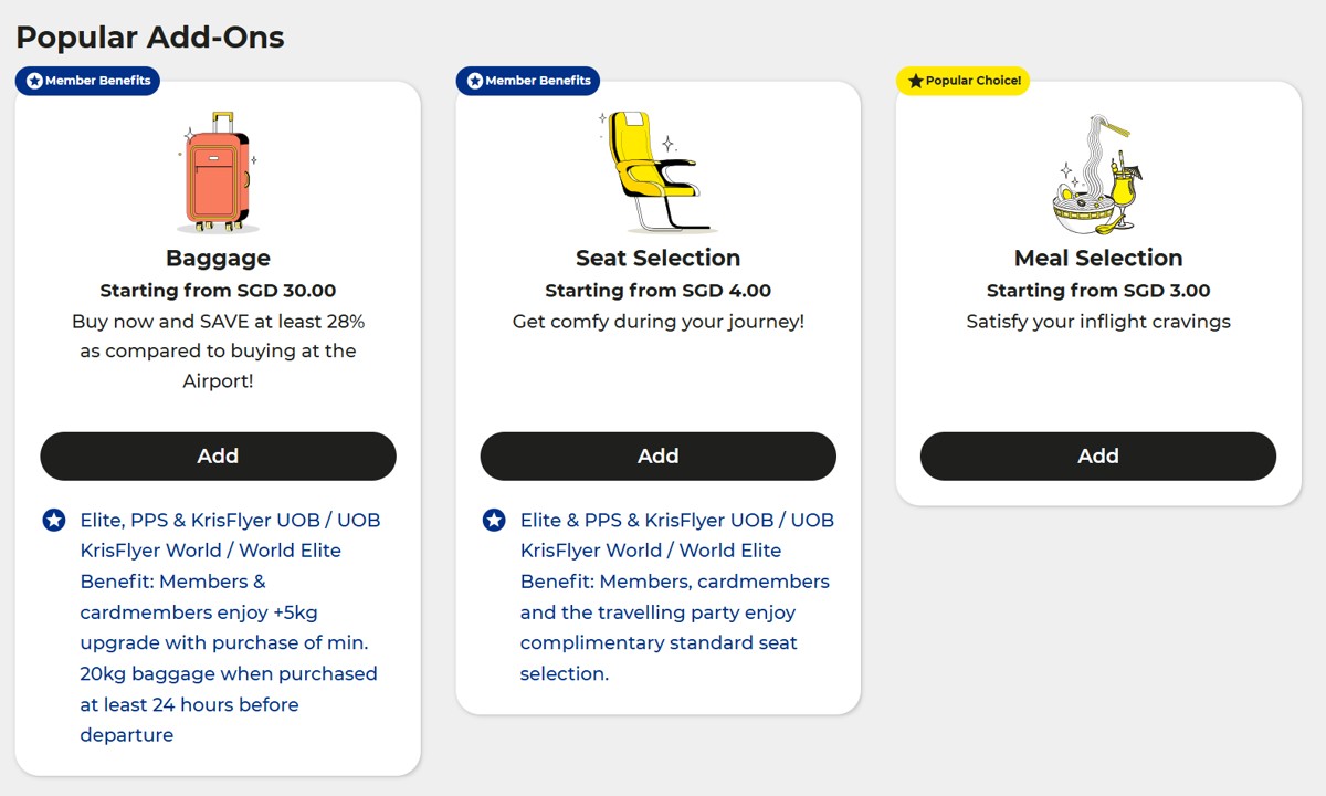 To enjoy these benefits, KrisFlyer UOB Cardholders must book their Scoot tickets using the dedicated Scoot x KrisFlyer UOB portal. If you book your tickets through the public website, or a third-party OTA, it will not be possible to retroactively add the benefits.
