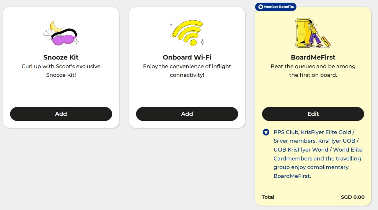 Solitaire PPS Club, PPS Club, KrisFlyer Elite Gold and KrisFlyer Elite Silver members also enjoy additional perks when travelling on Scoot.
