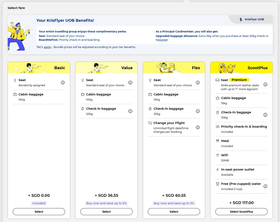 Here’s a summary of the benefits that KrisFlyer UOB Cardholders enjoy on Scoot flights.