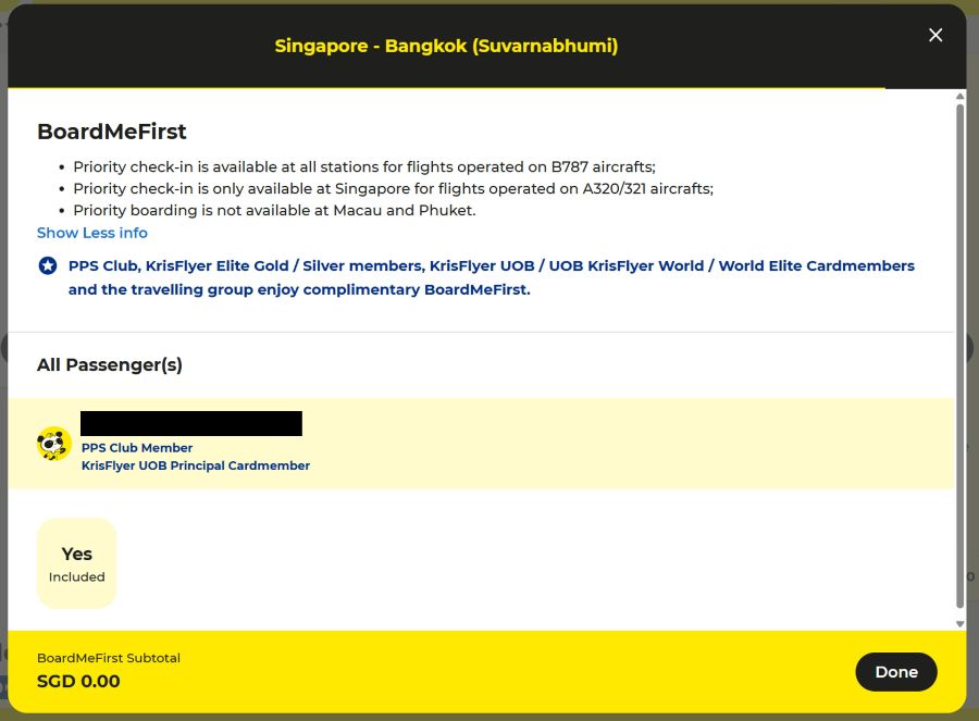 KrisFlyer UOB Cardholders receive complimentary BoardMeFirst, which includes priority check-in and boarding. This covers the entire travelling party on the same itinerary, whether or not your companions are cardholders too.