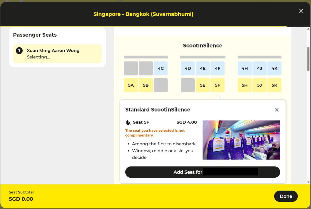 Do note that not every Standard Seat can be selected for free. For example, the Boeing 787 has a forward cabin called “Scoot-in-Silence” (reserved for passengers aged 12 and above), and selecting a Standard Seat here still requires extra payment.