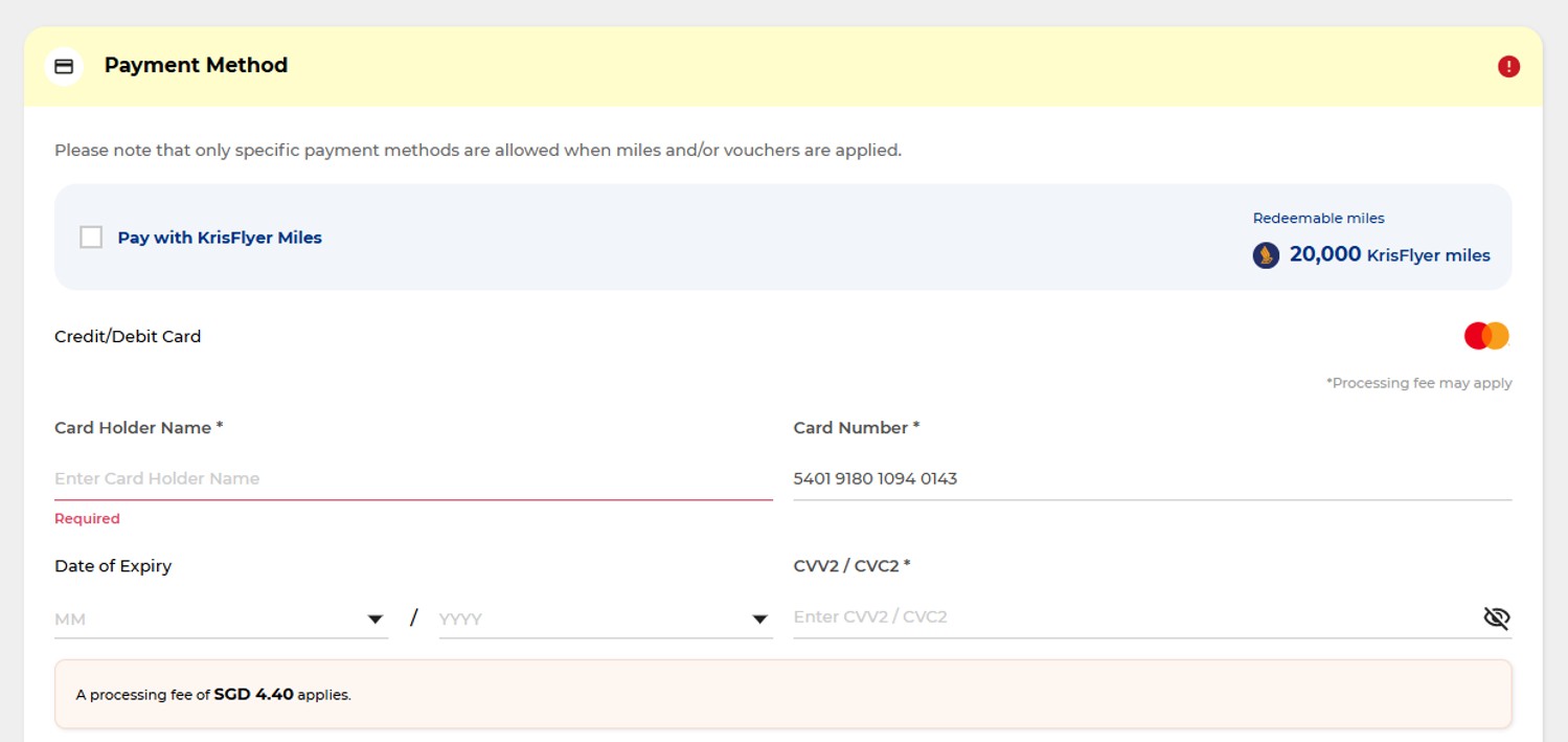 Second, you must pay directly with a KrisFlyer UOB Credit Card, which will incur a 2.2% payment processing fee (this was originally 2.6% when Scoot reintroduced fees in February 2025, but Scoot has generously cut it to 2.2% since).
