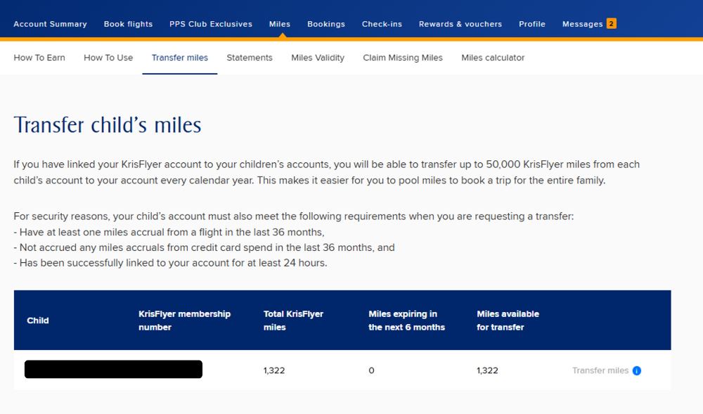 KrisFlyer for Families allows parents to transfer up to 50,000 miles from their child’s account to their own each year, and is currently the only way of transferring miles between two individual accounts.