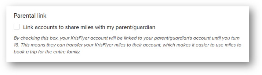 This will trigger an email to the parent, who then logs in to their own KrisFlyer account to confirm the linkage. Accounts will be linked until the child turns 16.