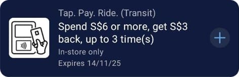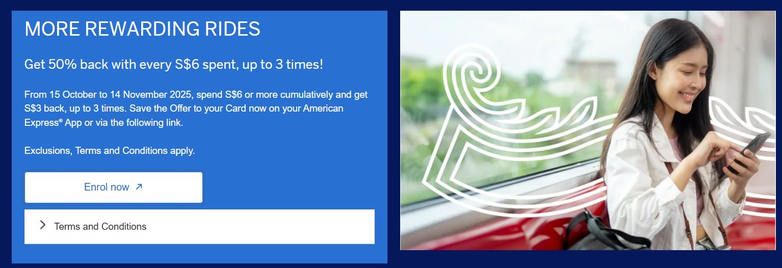 AMEX cardholders who register for this offer will receive a S$3 statement credit when they spend at least S$6 (in one or more transactions) on SimplyGo rides between 15 October and 14 November 2025.
