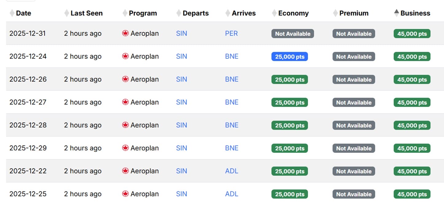 Fifth, Aeroplan sometimes gets better access to Singapore Airlines award space than even KrisFlyer members. Yes, as unfair as that sounds, I’ve seen numerous cases of this happening. For instance, Aeroplan can see three Business Class seats on the SQ231 flight from SIN-SYD…