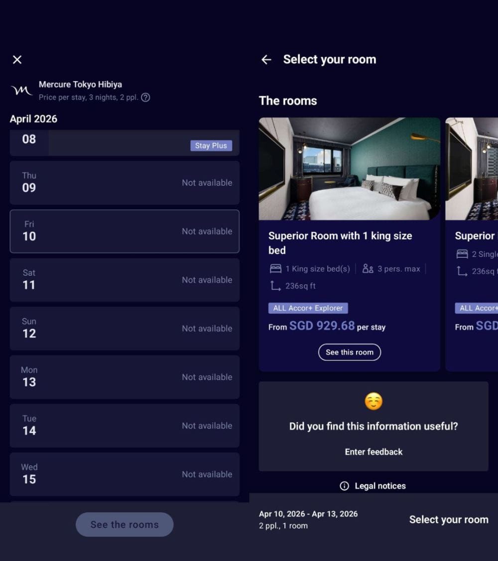 For example, we can see below at the Mercure Tokyo Hibiya that no Stay Plus is offered for 10-13 April 2026, despite rooms being available for sale.