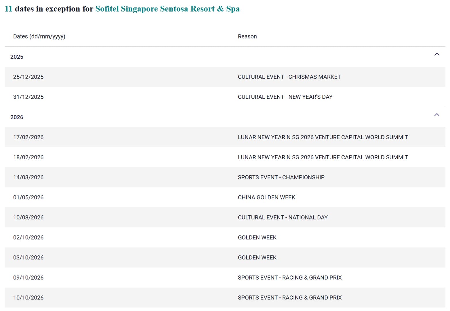 Accor has created a tool that allows you to check blackout dates for a given property. Here’s what it looks like at the Sofitel Singapore Sentosa, for example.