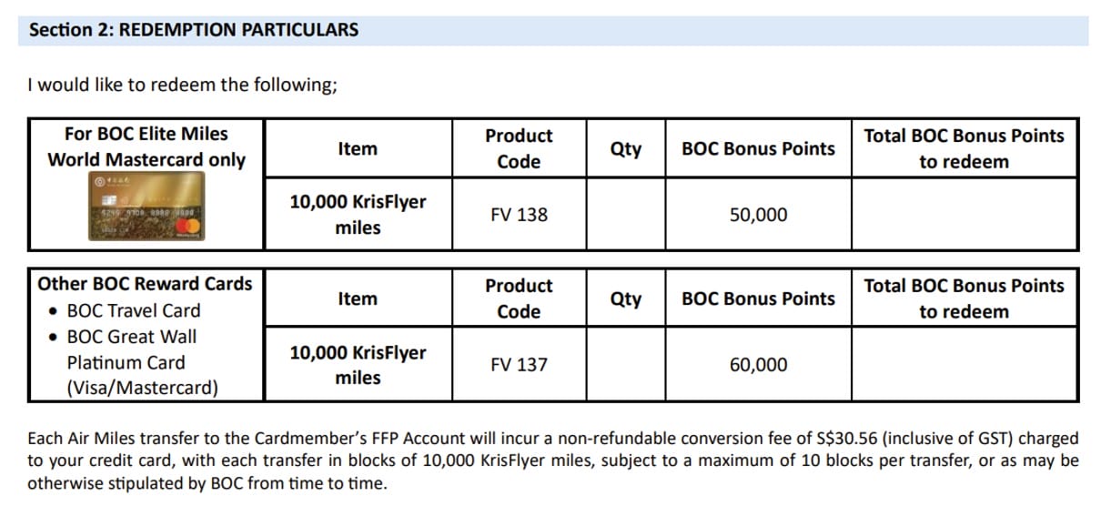 Moreover, BOC also charges S$30.56 per transfer, and limits you to converting a maximum of 100,000 KrisFlyer miles at a time. If you want to transfer more than that, you’ll need to complete a second form, and pay a second fee.