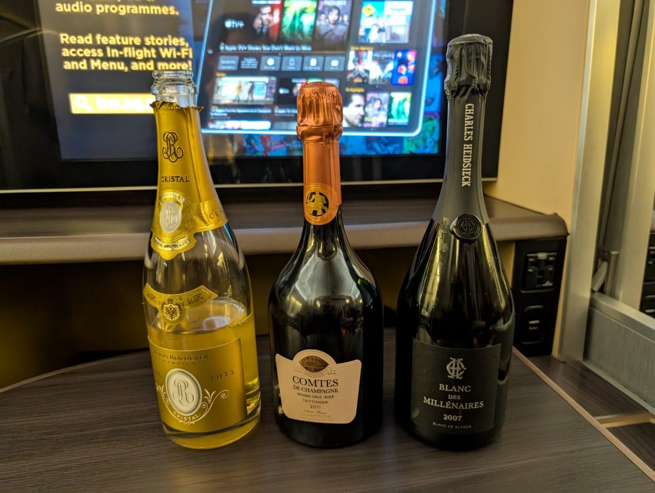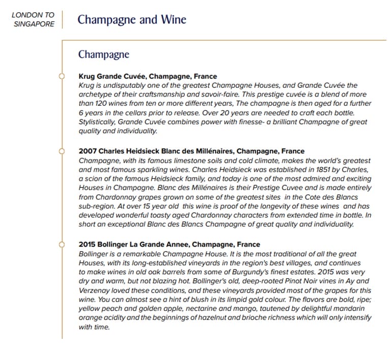 The “core champagne” available on all Suites/First Class routes will be the 2007 Charles Heidsieck Blanc des Millénaires (also excellent), while the second choice will either be Krug Grande Cuvée or 2015 Louis Roederer Cristal Millésimé Brut, depending on route.