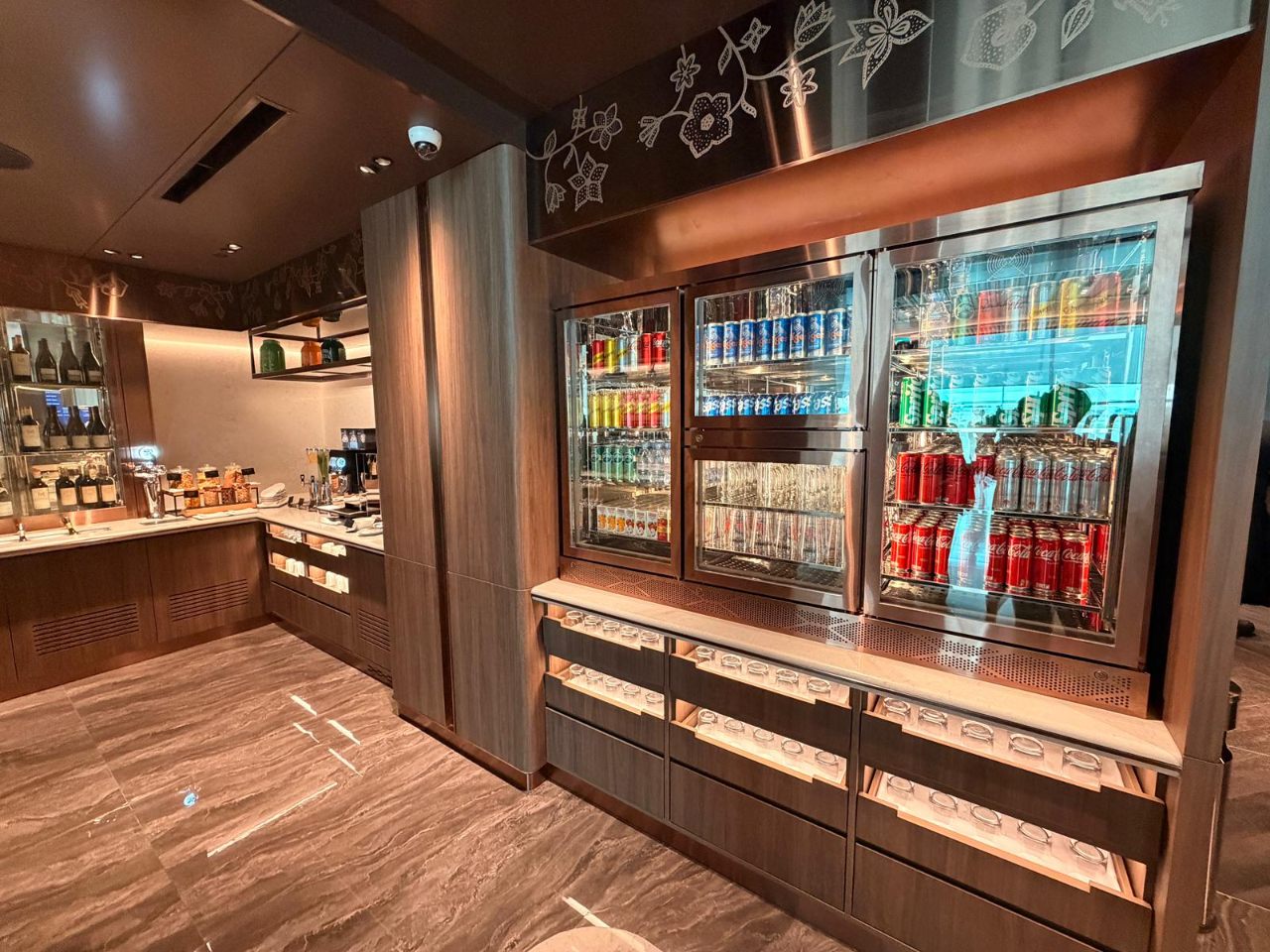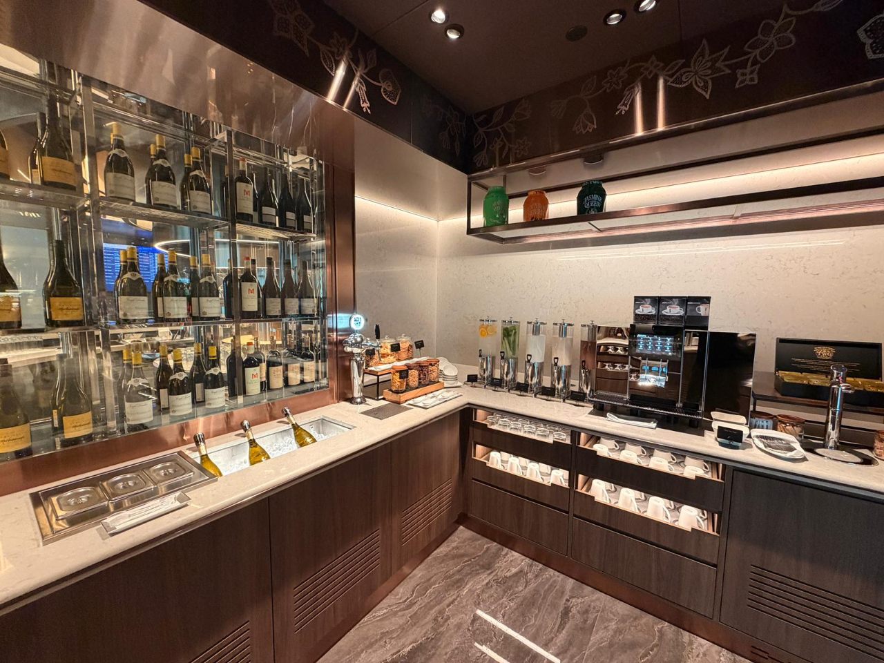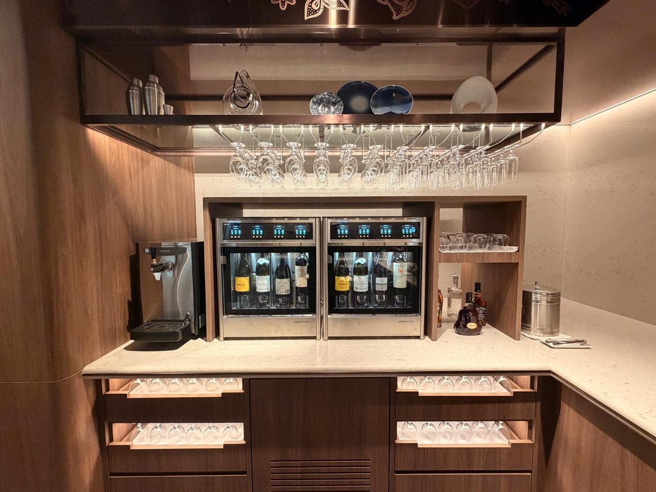 On the opposite side of the bar is a self-serve drinks area, with single pour wine dispensers, bean-to-brew coffee machines, soft drinks, TWG teas, liquors and mixers.
