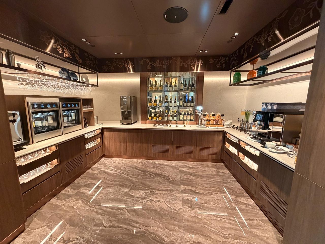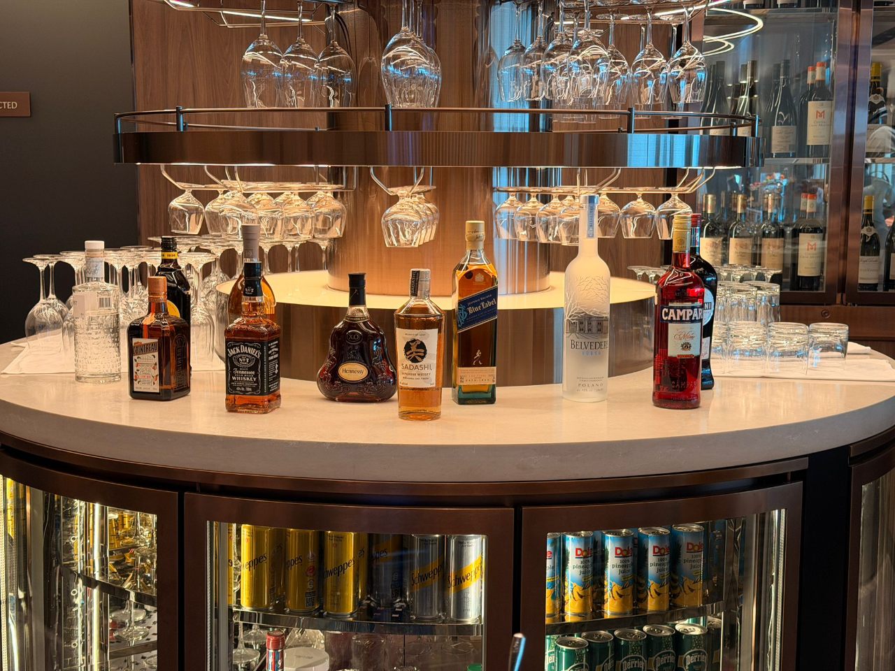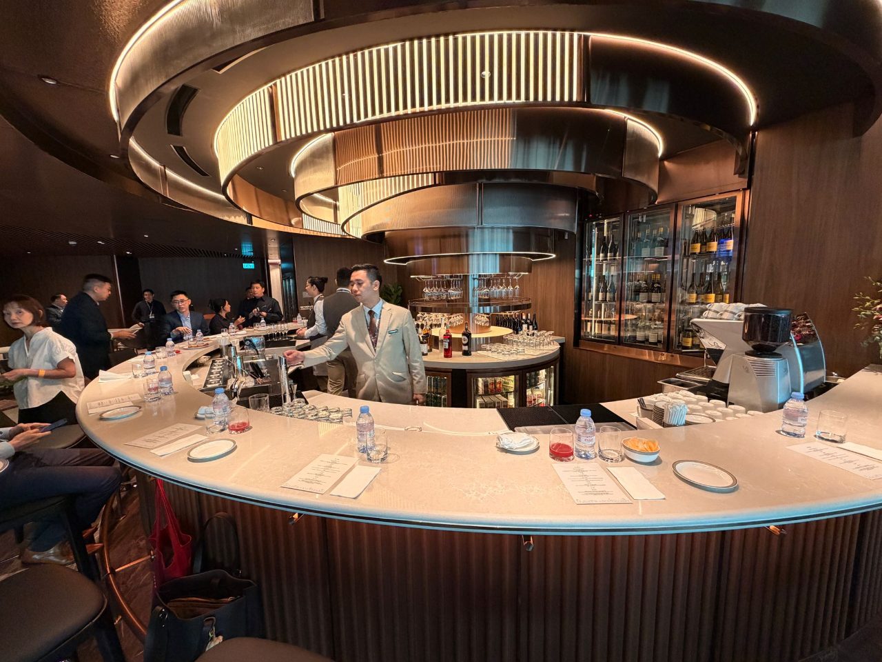 On the opposite side of the bar is a self-serve drinks area, with single pour wine dispensers, bean-to-brew coffee machines, soft drinks, TWG teas, liquors and mixers.