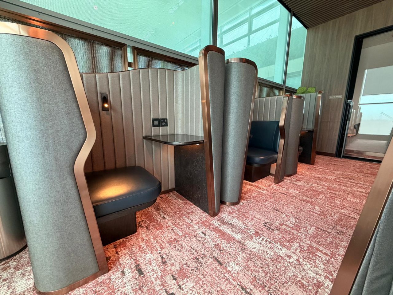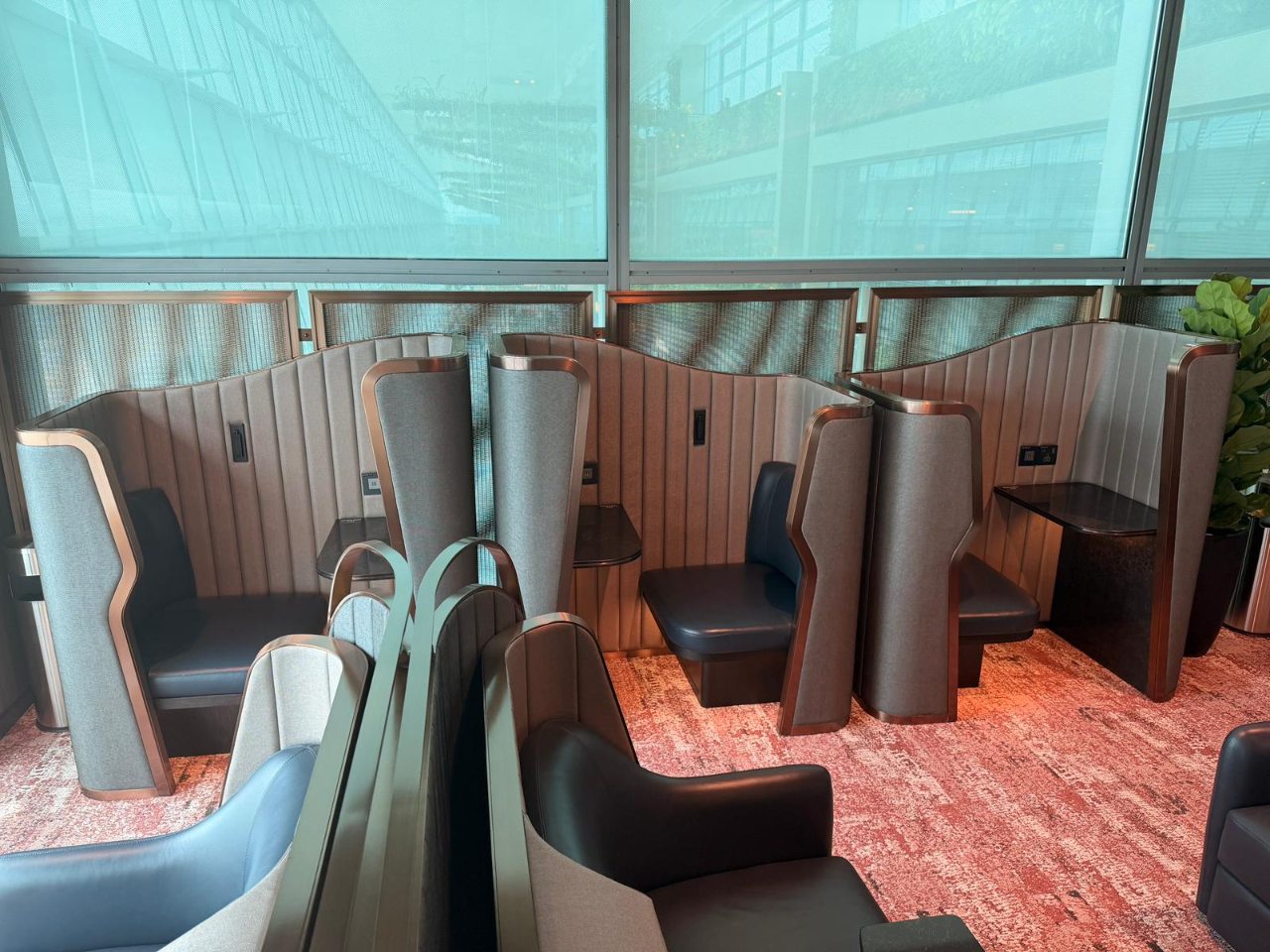 These are similar to the ones you’ll find in T3, with a sleek semi-enclosed design that strikes a balance between privacy and openness. Each pod consists of a high-backed, curved frame upholstered in textured fabric with brass trim accents, designed to provide acoustic and visual isolation from adjacent seats. The seats are clad in deep, dark blue leather, with a reading light and charging outlets.
