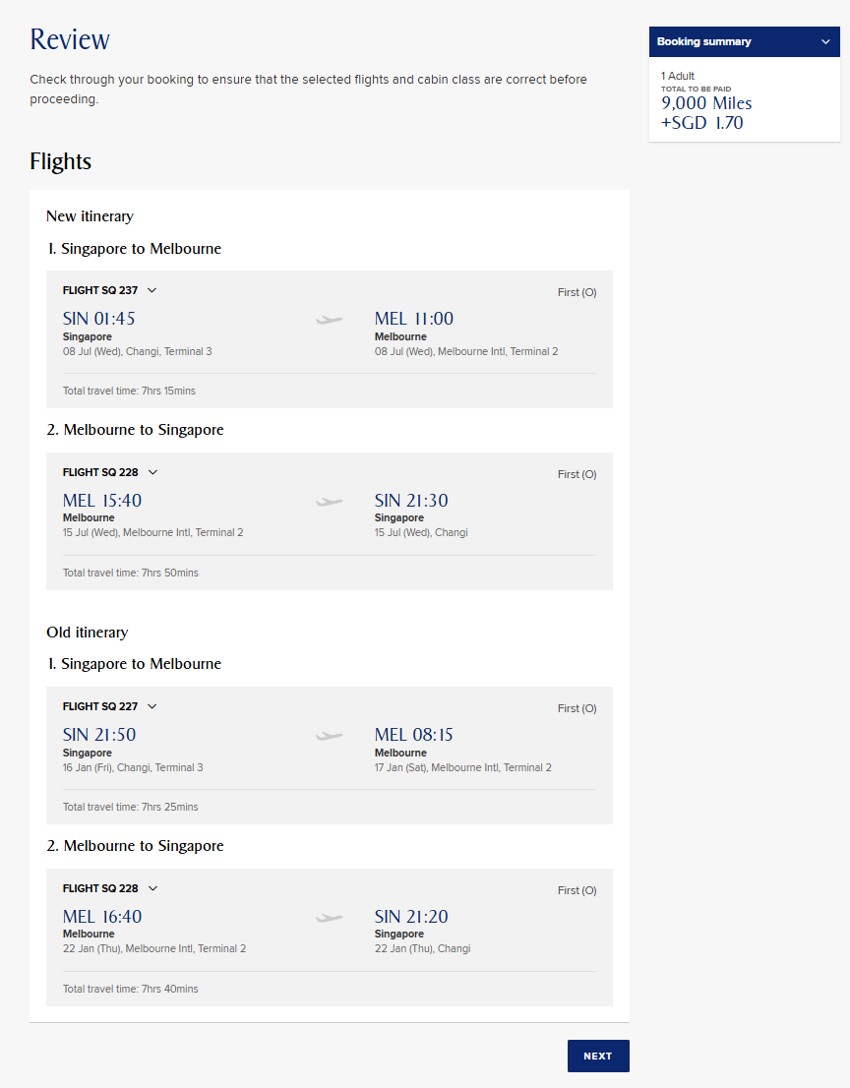 For example, here’s what happens when I attempt to change a pre-devaluation round-trip First Class Saver award between Singapore and Melbourne.