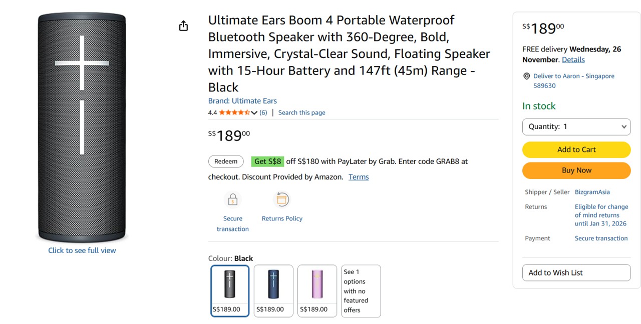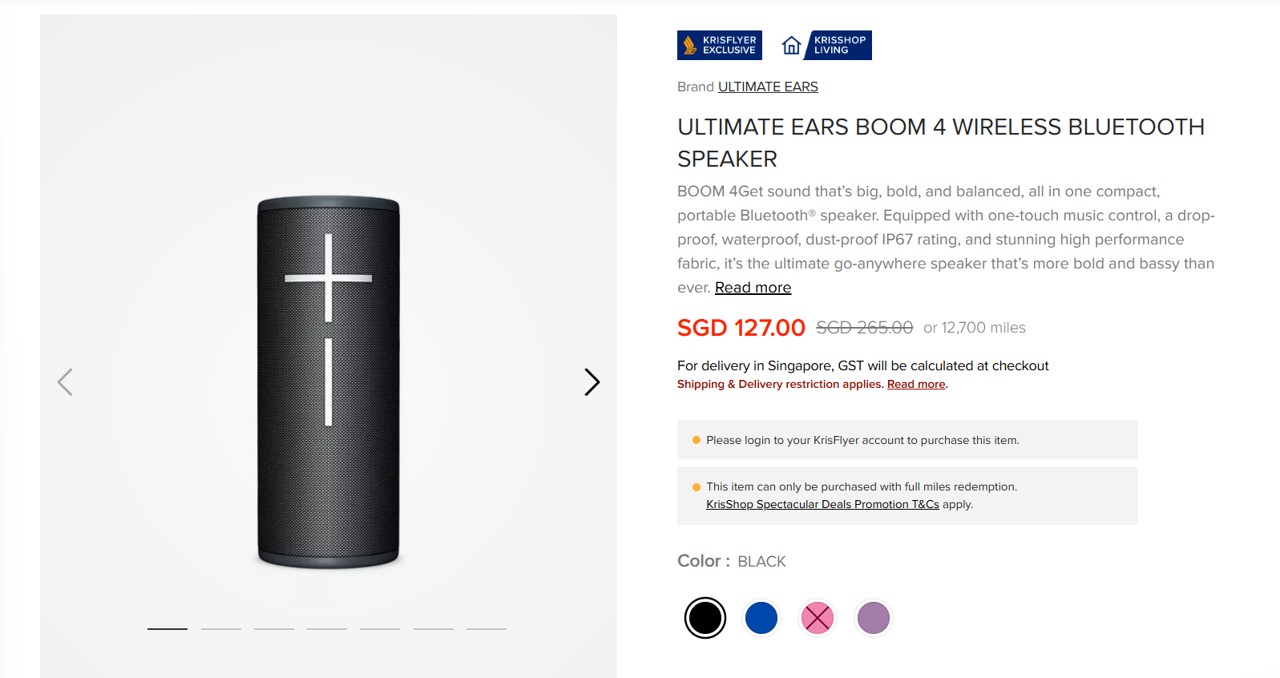 For example, this Ultimate Ears Boom 4 speaker has a list price of S$265 on KrisShop, but has been discounted to 12,700 miles. You might think you’re getting a value of 2.09 cents per mile (S$265/12,700 miles).