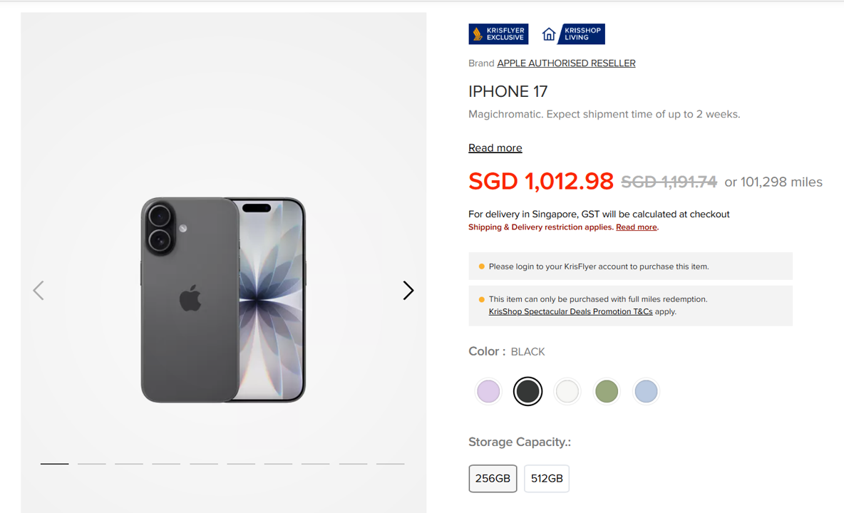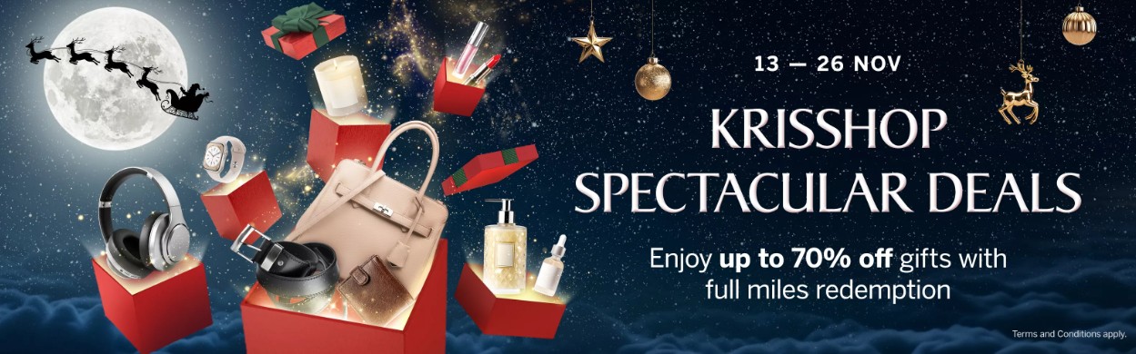 From 13-26 November 2025, KrisShop customers can offset purchases at a rate of up to 30 KrisFlyer miles = S$1, a 70% discount from the usual 100 KrisFlyer miles = S$1. The entire purchase must be paid for with miles for the discount to be valid.