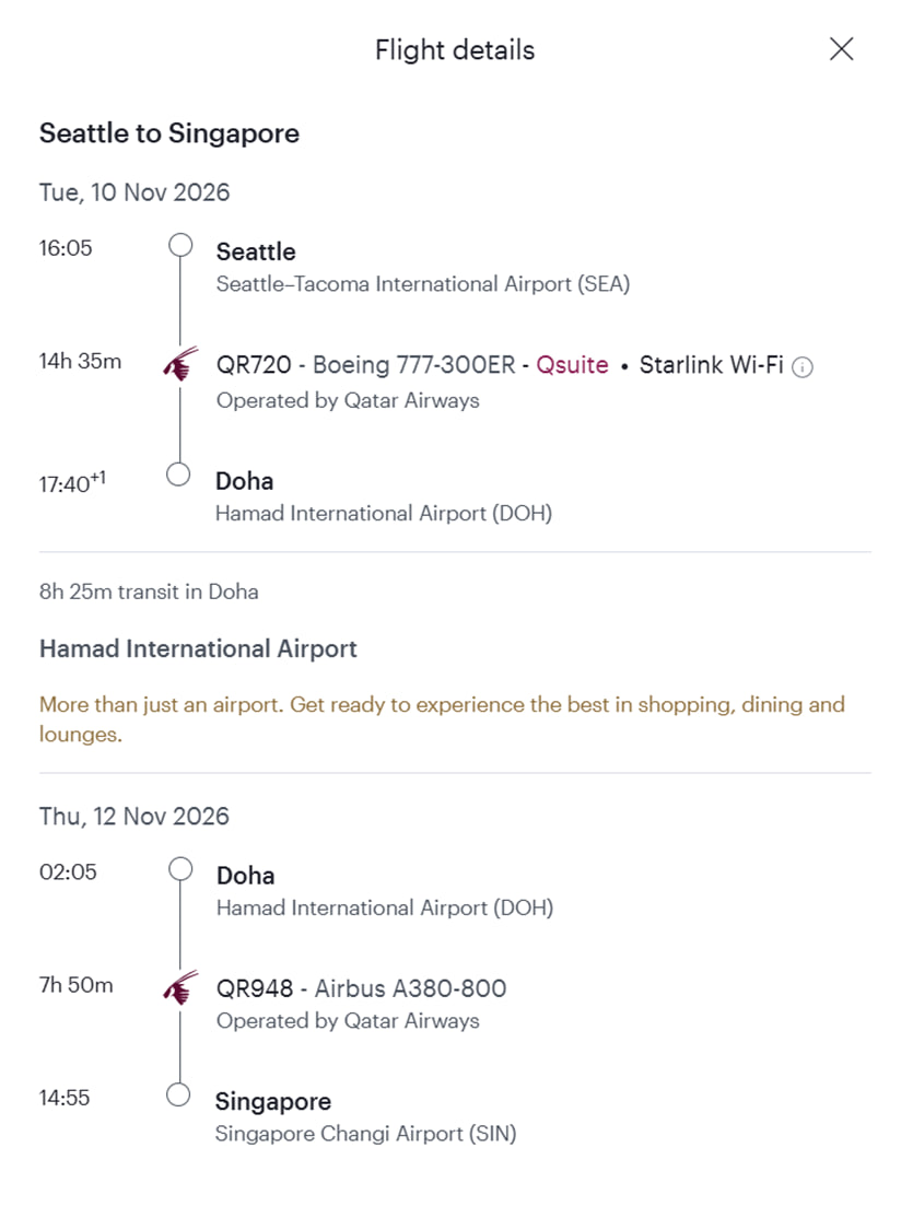 Here’s a sample itinerary from SEA-DOH-SIN: