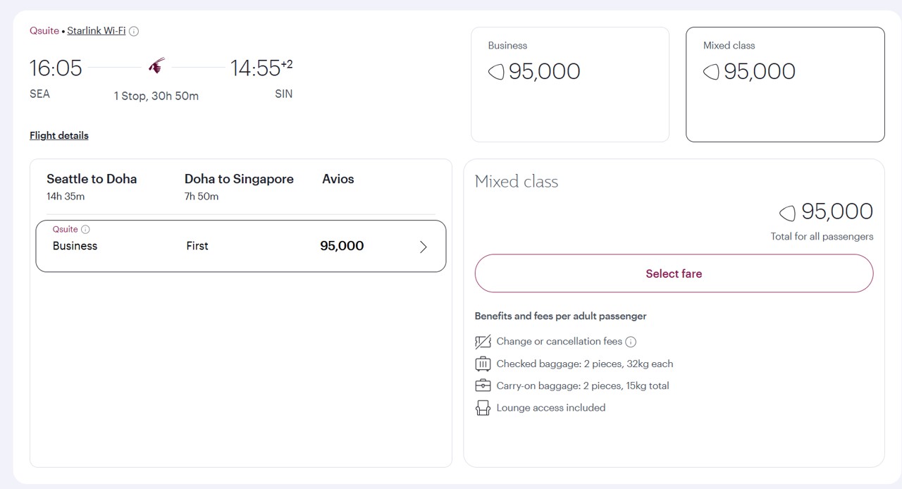 But here’s the good news: you can book mixed-cabin awards from SIN-DOH-X (or vice versa) with SIN-DOH in First Class, and DOH-X in Business Class, and pay just the Business Class rate for the entire journey!