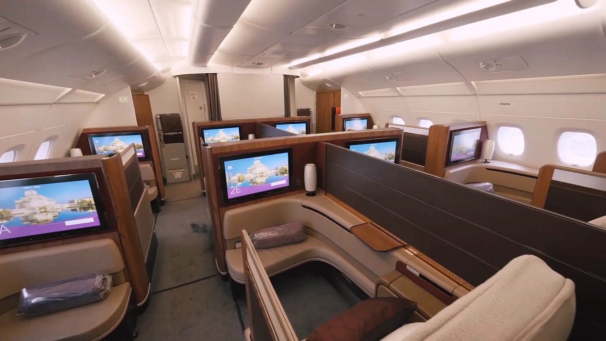 That said, on the A380 you can expect an eight-seater cabin with the airline’s signature, refined finishes (i.e. not bling). While the seats don’t have doors, there are movable dividers that can offer additional privacy. You can check out OMAAT’s review here.