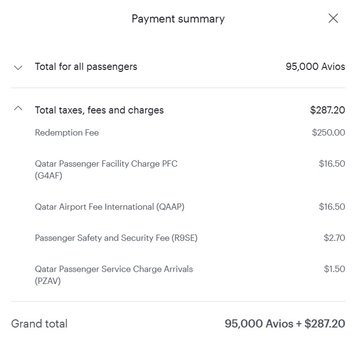 After adding in Qatar’s junky “award redemption fees”, you’ll have to pay US$287.20 in cash, but for 14.5 hours in Qsuites, 8.5 hours at the Al Safwa lounge, and 8 hours in First Class, I think I can overlook it!