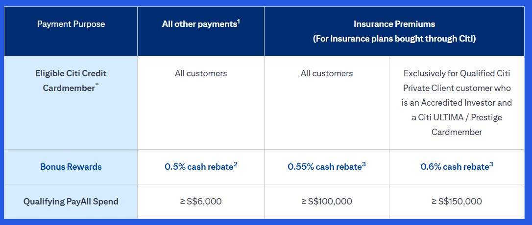 For example, to earn a 0.55% cash rebate, cardholders must spend at least S$100,000 in Citi PayAll payments for Citi insurance premiums. If they are Citi Private Clients customers with Accredited Investor status and also Citi ULTIMA/Prestige Cardholders, they can earn a 0.6% cash rebate- provided they spend at least S$150,000 in Citi PayAll payments for Citi insurance premiums!