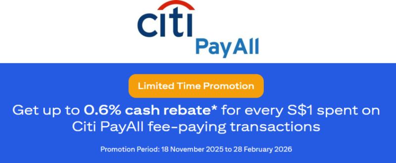 Cardholders will need to pay the regular 2.6% fee for Citi PayAll payments made during the promotion period. The 0.5% fee rebate will be credited within 12 weeks from the end of the promotion period, i.e. 23 May 2026.