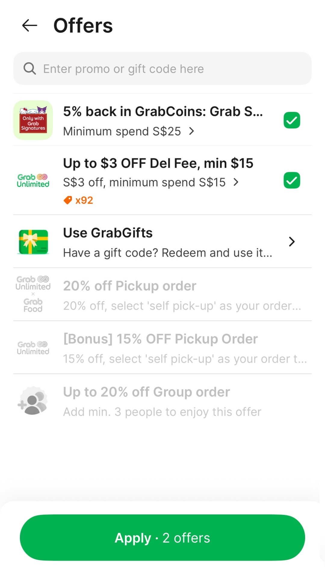 The good news is that selecting the GrabCoins offer on GrabFood does not prevent you from using other promo or gift codes, such as free delivery for GrabUnlimited subscribers.