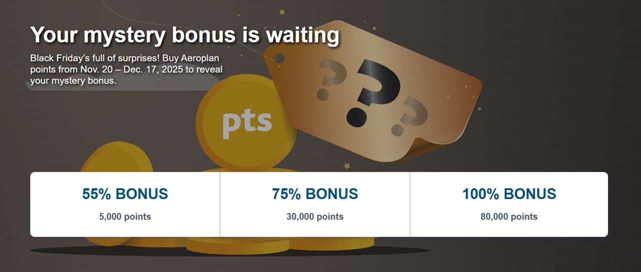 Aeroplan has launched a new sale that offers up to a 100% bonus on points purchases made by 18 December 2025, reducing the cost per point to 1.74 cents.