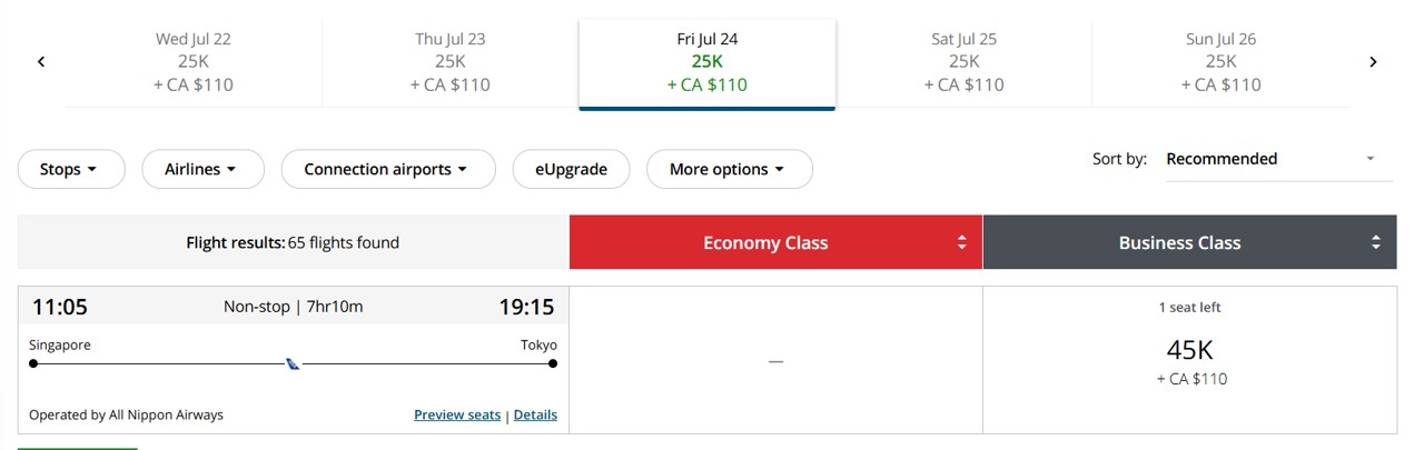 Third, adding an infant costs just 2,500 points or C$25 (~S$23) per segment, regardless of cabin class. That’s right, even if you’re in First Class, you’ll pay at most C$25, not 10% of the commercial fare!