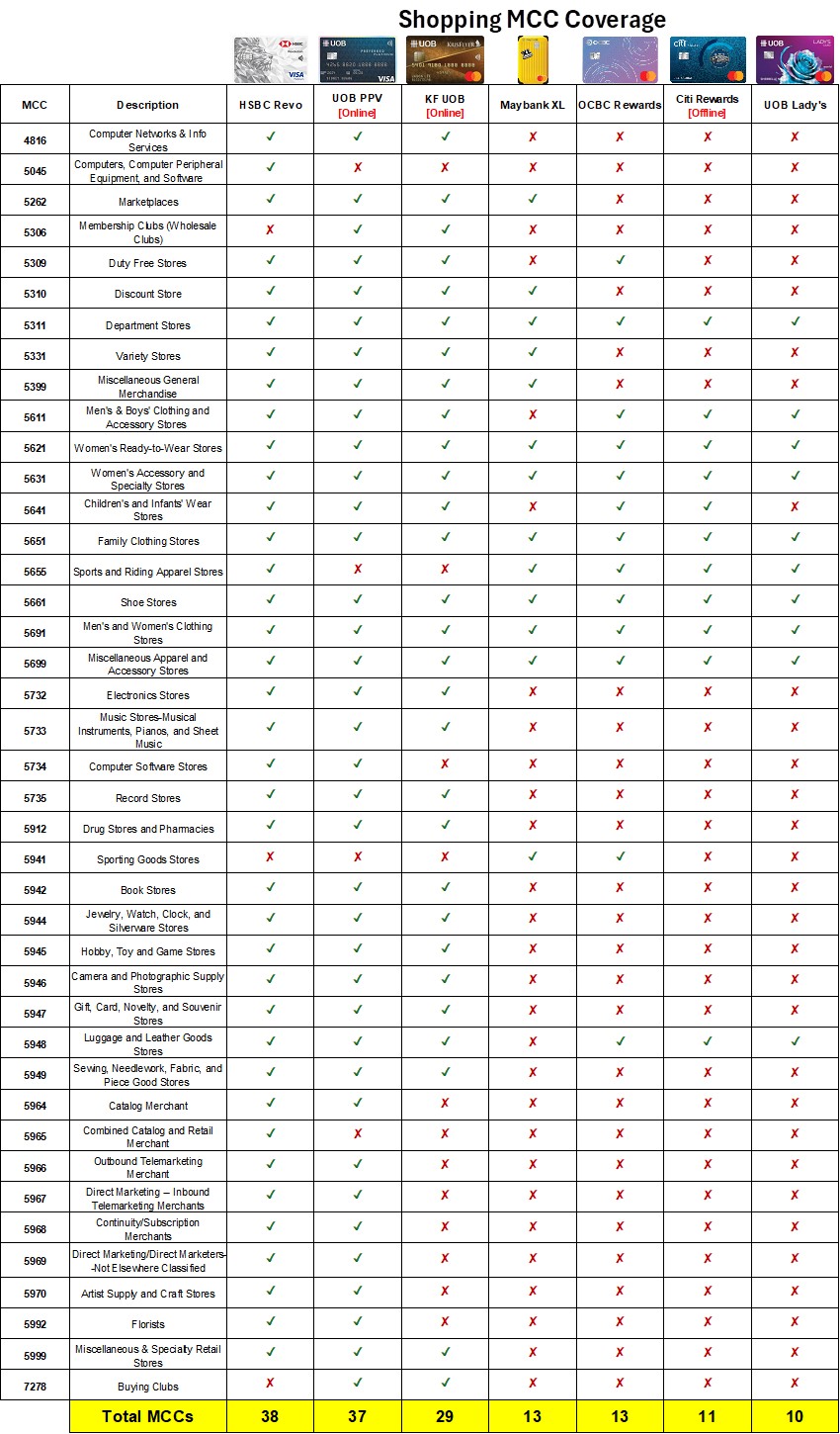 As it turns out, a total of 41 MCCs can come under the umbrella of shopping. I’ve summarised the results in the table below (for brevity’s sake, I’ve collapsed the UOB Lady’s Card and UOB Lady’s Solitaire into a single column).