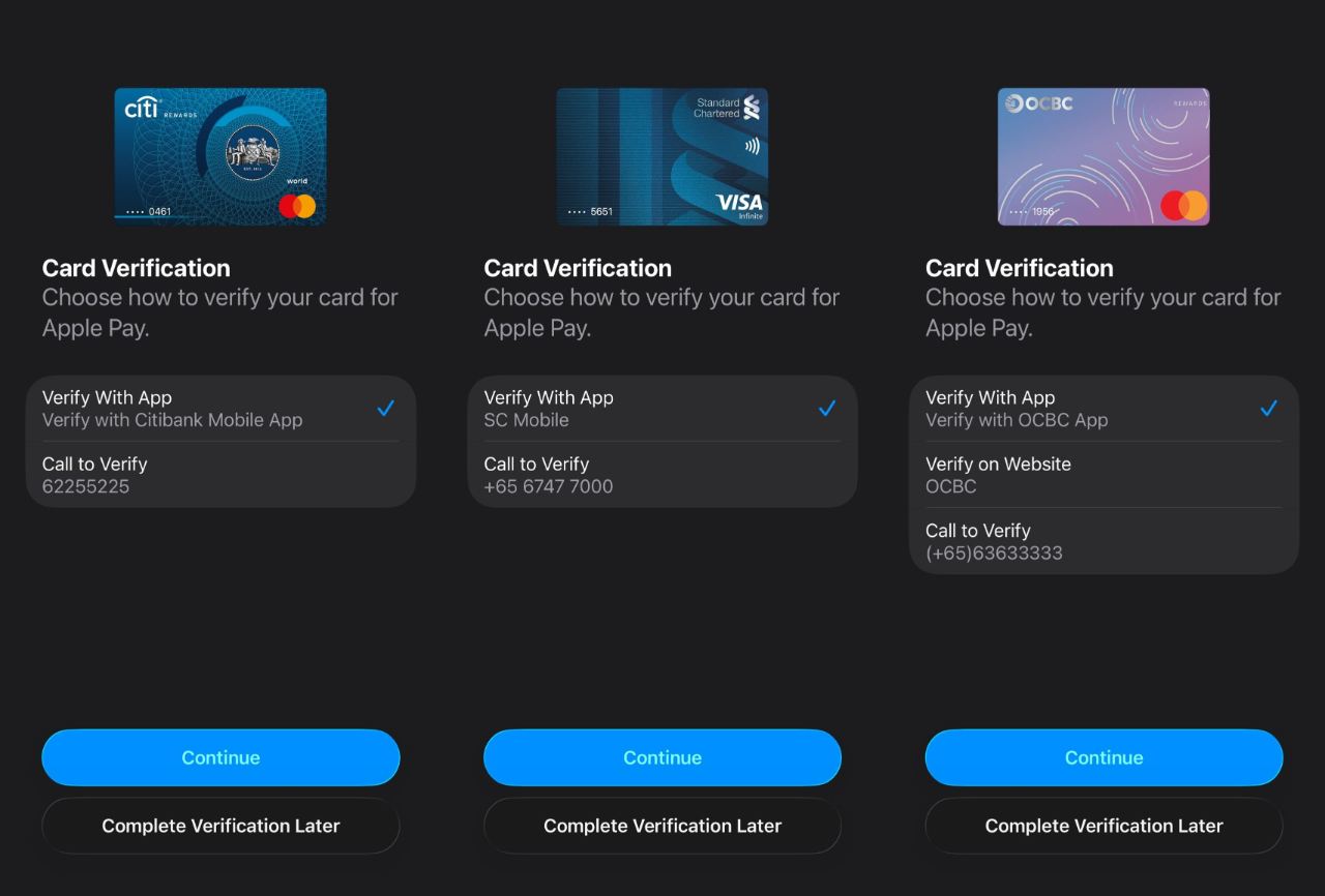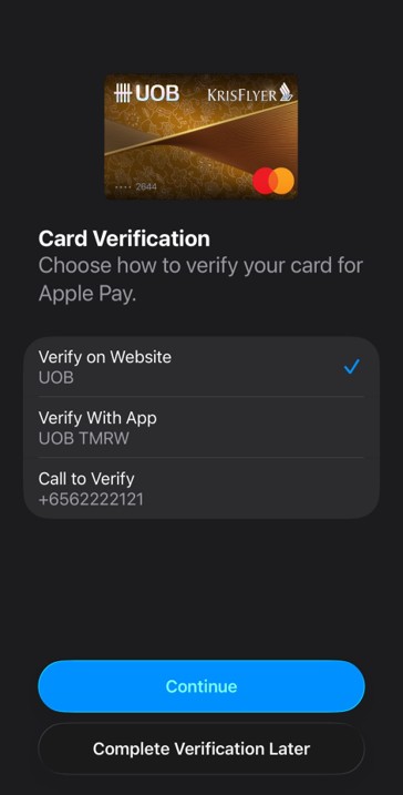 My wife, by accident, removed my UOB card from her Apple Wallet about a week ago. When adding it back, there was no Verify on Website option. It was either verify on the app or call UOB – in other words the behavior was the same as for Citi and the others in that list.