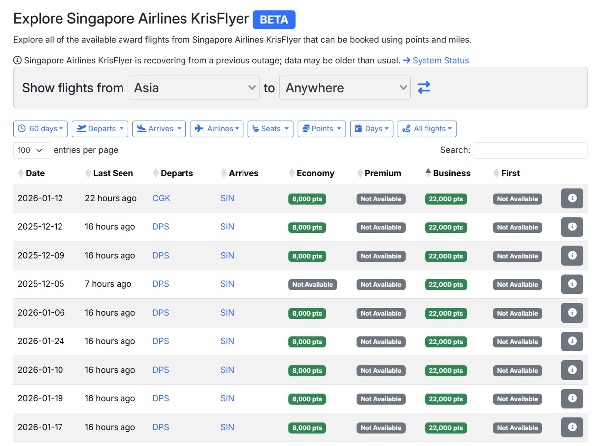 Unfortunately, no sooner had it been added than a back-end tweak broke Seat.Aero’s search ability. But after a long outage, Seats.Aero is now displaying KrisFlyer award space once again!