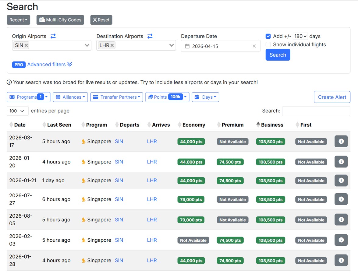 If you’re only interested in Saver awards, you can set a points filter based on what you know the price should be. For example, if I were interested in Singapore to London Business Saver awards, I’d set my points filter for 109,000 (technically 108,500, but the increments are fixed in blocks of 1,000).