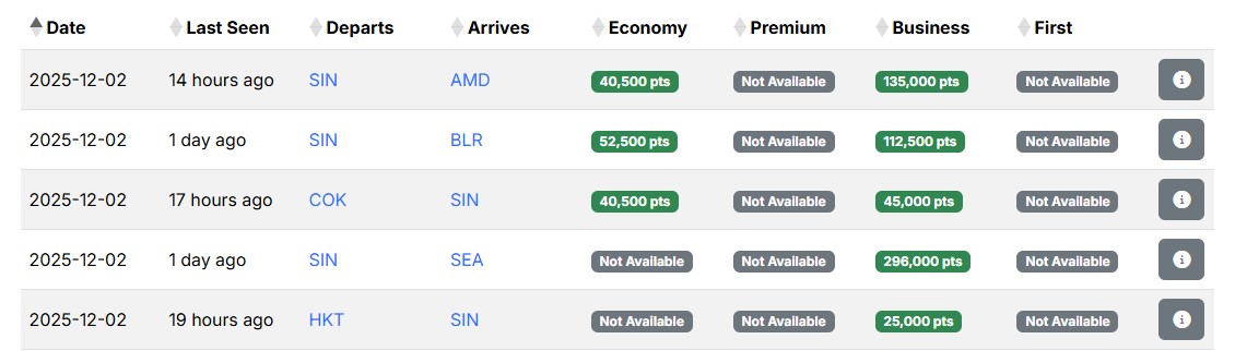 Seats.Aero has restored KrisFlyer functionality, allowing users to view up to a year’s worth of Singapore Airlines awards with a few mouse clicks. This can be a massive time saver, since you don’t have to keep poking in the dark with dates and destinations, hoping something turns up.