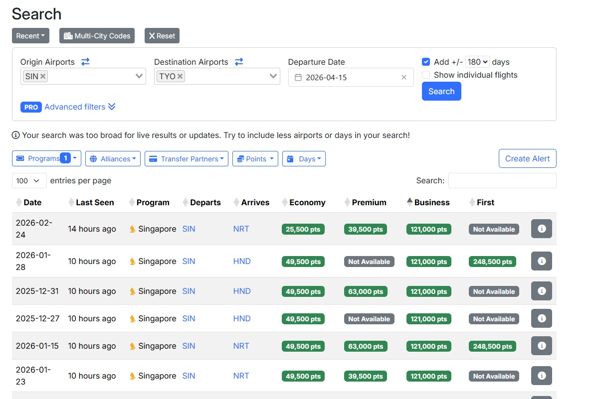 If you have a specific destination in mind, head to the Search page. Enter the origin and destination, departure date and date range (+/-60 days for free accounts, full year for Pro). Hit ‘Search’, then under ‘Programs’ select Singapore Airlines KrisFlyer to filter the results.
